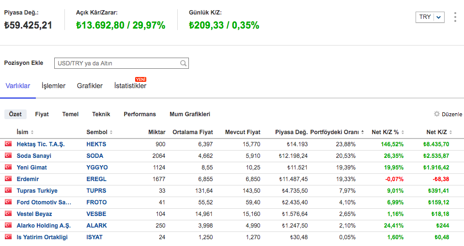 Evet bu ayki ufak al-sat lar sonunda yiğit beyinde dediği gibi portföy yavaş yavaş oturmaya başlıyor yalan yok dün e kadar elimde ne varsa ciktim çıktımki alttan koyabileyim yerine Allah yüzüme baktı iyi yerlerden çıkıp güzel yerlerden yerine koydum diye düşünüyorum KORDS u 11.95 alıp ardından 11.40 satmıştım şimdi 10.90 ve 10.70 den iki parça alım yaptım ufak bir zararla bekliyorum NUHCM 6.85 lerden almıştım ardından 7.90 dan bir alim daha yaptım hepsini 8.65 den verdim şimdi tekrar 8.08 den geri aldım 😉 buradaki operasyon güzel geçti ama birdaha tövbe gerçekten stres testi yaşıyorsunuz ya alamazsam ya satamazsam diye bu arada ULUUN mevzusunu düşündüm taşındım düşünce olarak güzel lakin hisse seçimi olarak yanlış olduğu kanısına vardım araştırıyorum ufak ufak alım yapabileceğim gıda şirketi pınar lar takibimde. Son olarak güncel portföy aşağıdadır 😉 KORDS 10.80 Maliyetle 177 lot.