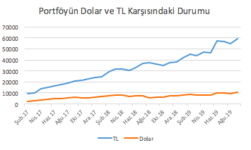 Dolar da bu ay sakinleşti ve düşmeye başladı. Ağustos 2019 sonunda 5.89 civarlarındaydı. Eylül 2019’u ise 5,65’ten kapattı. Dolardaki her düşüş portföyümün değerini arttırıyor.