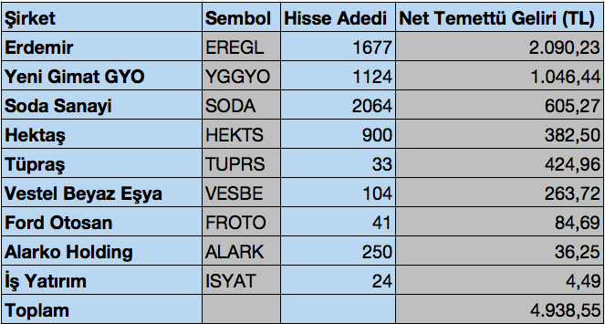 Size müjdeli bir haberim var. Sonraki 12 ayda küçük ortağı olduğum hisselerden alacağım temettülerin toplamı iki aylık asgari ücret tutarını aşarak 4.938 TL’ye ulaştı.