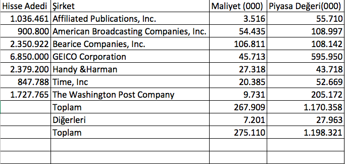 Aşağıdaki tablo 1985 yılı sonundaki hisse senedi varlığımızı gösteriyor. Piyasa fiyatı 25 milyon doları aşan tüm pozisyonlarımız listelenmiş durumda ve Wesco ve Nebraska Furniture Mart’ın azılık paylarını da çıkarmış durumdayız.