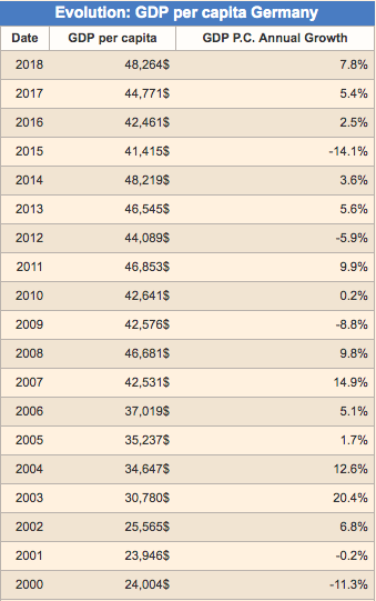 Şimdi bunu örneklendirelim. 2000 yılında Almanya GDP’si 24.004 dolarmış. 2018’de 48.264 dolar.