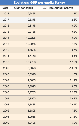 Türkiye’nin GDP’si ise 2000 yılında 4.219 dolarken, 2018 yılında 9.346 dolar olmuş.