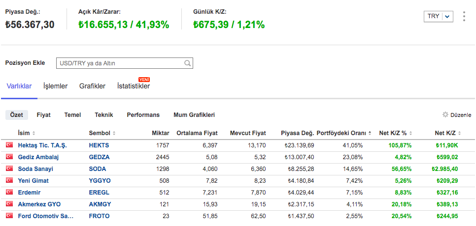 Hemen investing.com’da yaptığım klasik portföyü vereyim.