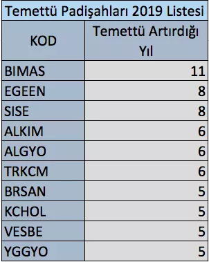 2019 yılında yaptığım Temettü Padişahları 2019 listesinde 10 tane şirket bulunuyordu.