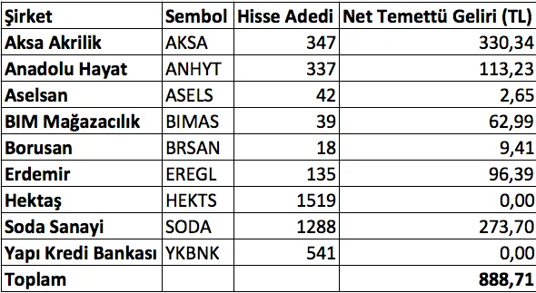 Bundan tam bir sene önce ileriye yönelik temettü gelirim 888 TL idi. Temettü gelirlerim de aşağıdaki şekildeydi.
