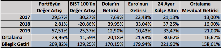 Benim de kayit tutmaya başlayalı 14 ay oldu.2019 yılı değer kazancı %30. Tasarruflarla beraber portföy büyümesi %55.
