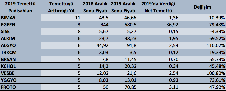 BIST 100’ün değer artışı %25,37 iken Temettü Padişahları 2019 listesinin değer artışı %55,26 olmuş.