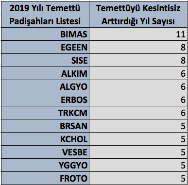 Görüldüğü gibi 2019 yılında temettüsünü en az beş yıl boyunca arttırmış 12 tane şirket vardı. Bunlardan BIMSA 11 yıllık temettü artışı ile rekoru elinde bulunduruyordu.