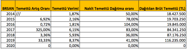 BRSAN 2020 yılında temettü dağıtmama kararı aldı. Böylece 2020 Temettü Padişahları Listesi’nden çıktı.