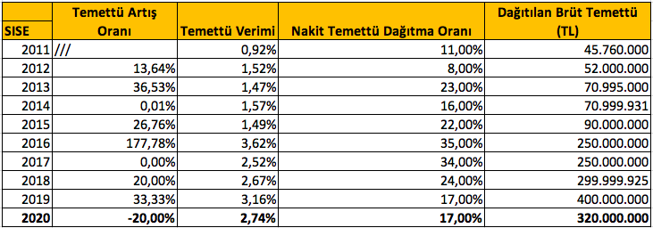 Temettüsünü 2020 yılında arttırmayıp Temettü Padişahları 2020 listesinden çıkan ilk şirket temettüsünü 8 yıl boyunca arttırmış olan SISE oldu. Maalesef dokuzuncu yılda temettüsünü azaltarak listeden çıktı.
