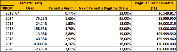 TRKCM 2019 yılında 170 milyon TL temettü dağıtmıştı. 2020 yılında ise dağıtacağı temettüyü %23,53 oranında düşürerek 130 milyon TL’ye düşürdü. Böylece 6 yıllık temettü artışı serisine son verdi.