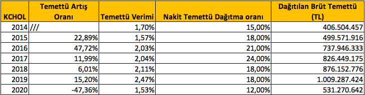 KCHOL aslında temettüsünü 2020 yılı için arttırmıştı. Fakat virüsün etkilerinden dolayı temettü teklifi genel kurulda onaylanmadı ve şirket temettüsünü neredeyse yarıya indirdi.