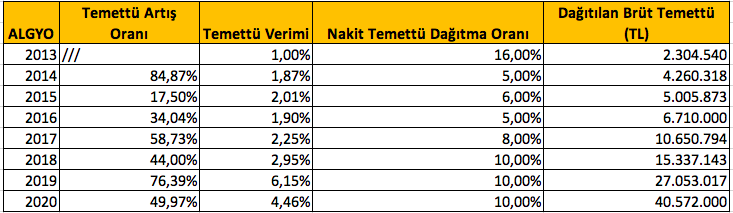 ALGYO 2020’de temettüsünü %49,97 arttırmayı başardı. Bu da ard arda yedi senedir temettüsünü arttırdığı anlamına geliyor. Hisse başı net 0,63 TL temettü verecek.