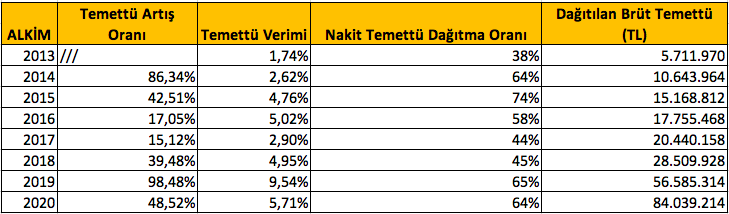 2020 yılında temettü artış oranı %39,70. Dağıttığı temettüyü 136.804.500 TL’den 191.110.500 TL’ye çıkarmış durumda.