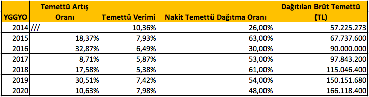 YGGYO temettüsünü 6 senedir arttırıyor. Bu seneki artış oranı %10,63. Enflasyon civarında bir artış olmuş.