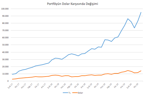 Ocak 2020 sonunda portföy, dolar olarak en yüksek seviyesine ulaşmıştı. Her ne kadar TL olarak yeni zirveleri görsem de döviz olarak hala bunun gerisindeyim.