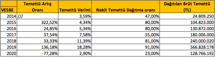 VESBE 2020 yılında temettüsünü %77,28 oranında düşürerek Temettü Padişahları listesinden çıktı.