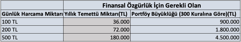 Mesela günlük harcaması 100 TL olan bir kişi için 36.000 TL’lik bir temettü geliri ya da 900.000 TL’lik bir portföy yeterli olur.