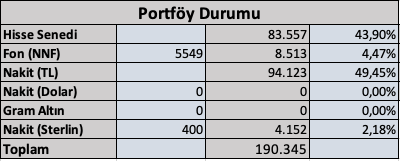 Portföyün nakit oranı da %41 seviyesinde bulunuyor ve mevduatta tutuluyor.