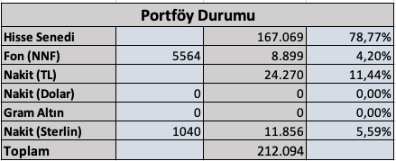 Portföyde 24.270 TL ve 11.856 TL karşılığı 1040 sterlin var.