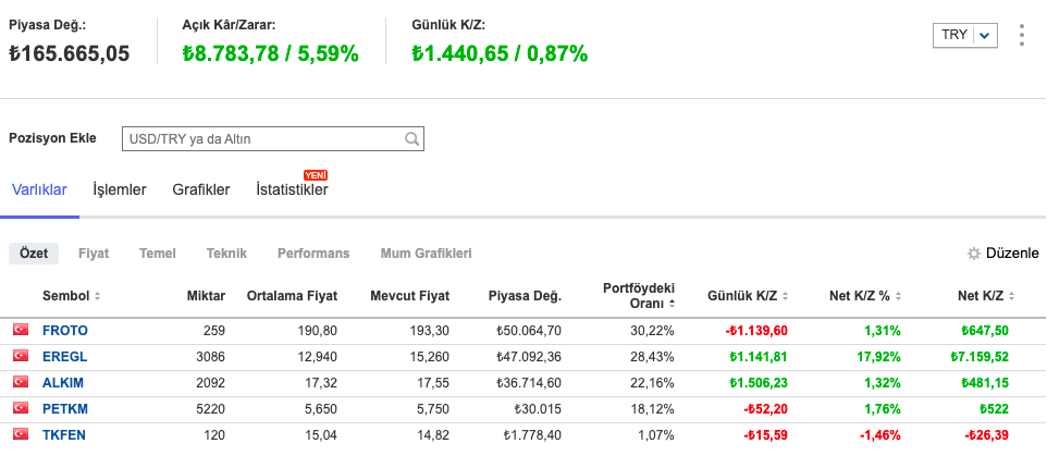 Son olarak da portföye ALKIM ve PETKM ekledim. Böylece portföy dört temel sütuna oturmuş oldu. FROTO’da yatırımı ve araç satışlarını, EREGL’de çelik fiyatlarını, PETKM’de petrokimya fiyatlarını, ALKIM’de de yatırımları takip ediyorum.
