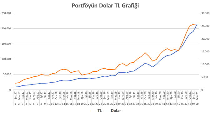 Toplamda ise başladığım 2017 Şubat’ından beri portföye 47.697 TL eklemişim. Dolar karşılığı da 10.074.