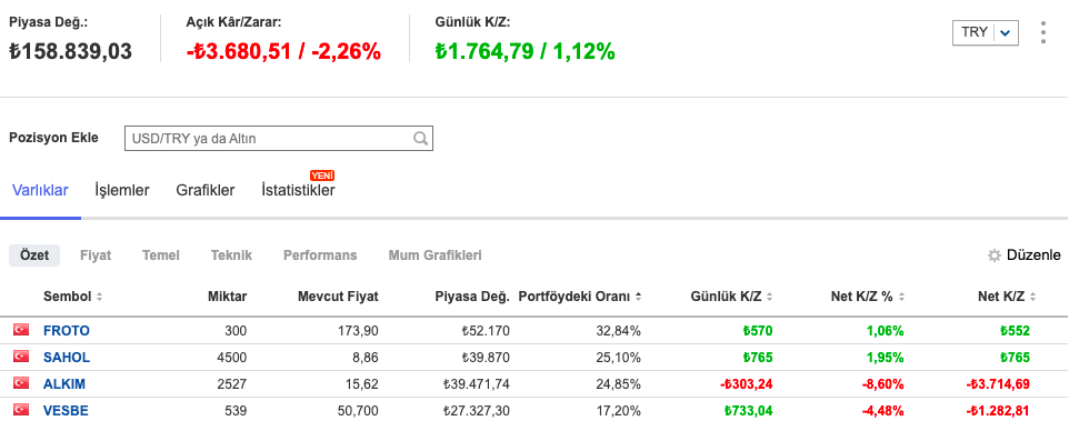 Satışlardan kalan tutarı da SAHOL ve VESBE pozisyonlarımı kayda değer şekilde arttırmak için kullandım.