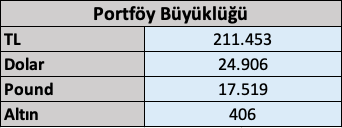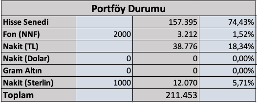 Portföyde 38.776 TL nakit ve 12.070 TL sterlin karşılığı olmak üzere toplam 50.846 TL nakit var.