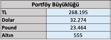 Portföyün nakit varlığı 5.695 TL ve 2.169 Sterlin karşılığı 24.792 TL olmak üzere toplam 30.487 TL’den oluşuyor.