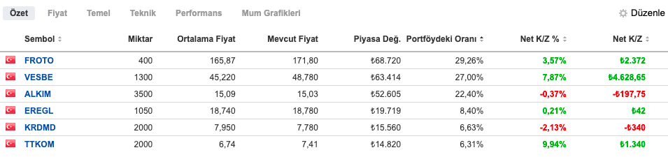 Portföyün bel kemiğini FROTO, VESBE ve ALKIM oluşturmaya devam ediyor. Bunlara %15 de demir çelik hissesi ekledim.