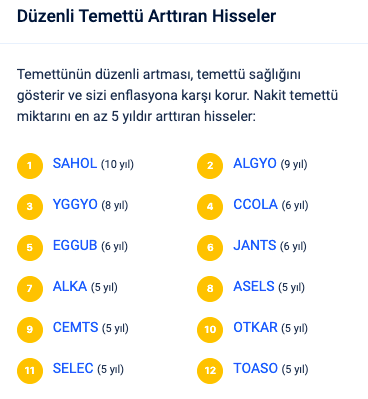 Her sene bu listeyi teker teker araştırarak hazırlamaya çalışıyordum. Fakat bu sene bunu @temettuhisseleri‘nden rica ettim, o da sağ olsun beni kırmadı, iki hokus pokusla:) temettüsünü en az 5 yıl boyunca arttıran şirketleri sitesine ekledi.