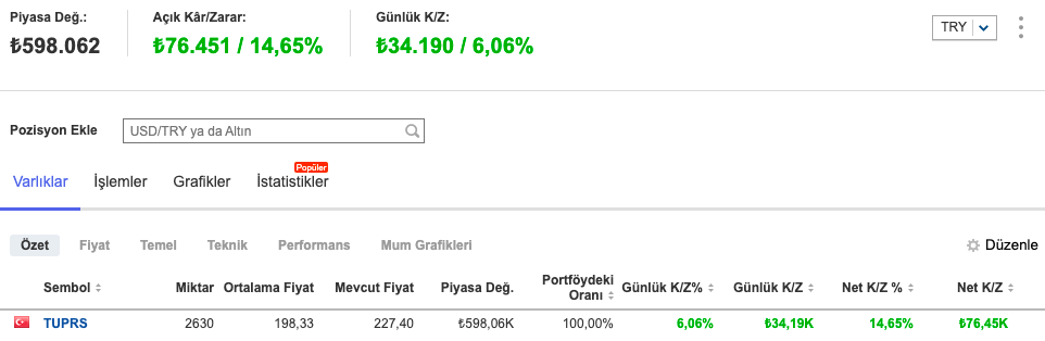 Şu an portföyün %100’ü TUPRS’tan oluşuyor.