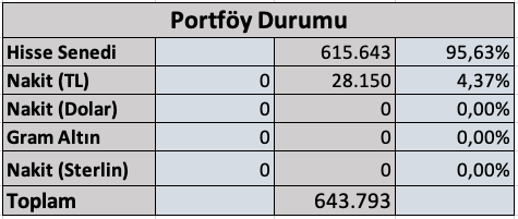 Portföyün %95,63’ü hisse senetlerinden oluşuyor. %4,37 de nakit var. Nakit de TL’de duruyor.