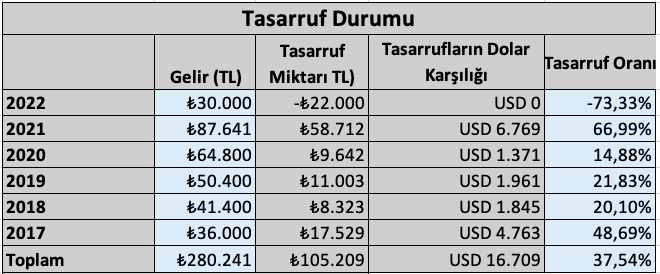 Yazının tasarruf kısmında her sene ne kadar eklediğimi ve dolar karşılığını gösteriyorum. Gözünüzden kaçmış olmalı.