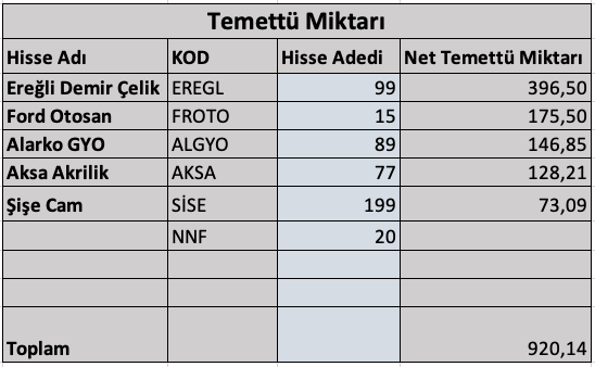 Böylece önümüzdeki 12 ayda alacağım toplam temettü miktarı da 920,14 TL’yi buldu. 2022 yılı için temettü hedefim 2.000 TL’ydi. Bu tutara ulaşabileceğim gibi gözüküyor. Belki de bu tutarı geçerim.