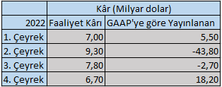 Berkshire 2022’de güzel bir yıl geçirdi. Şirketin faaliyet kârı (Genel Kabul Görmüş Muhasebe Standartlarına (GAAP) göre hesapladığımız), hisse varlıklarımızdaki sermaye kazanç ve kayıpların dışarıda tutulduğnda rekor kırarak 30,8 milyar dolara ulaştı. GAAP rakamı ise, bizim düzeltmemiz olmadan, her bilanço döneminde çılgınca ve mantıksızca dalgalanır. 2022’deki akrobatik ve çok da alışılmışın dışında olmayan sonuçlar şöyle: