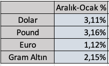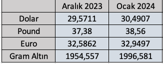 Dolar Ocak sonunu 30,49 TL ile kapattı. Pound 38,56, Euro 32,94 TL ile ayı bitirken güncü teyzelerin ezeli rekabetimizdeki yegane silahı altın da 1996,58 TL ile ayı bitirdi.