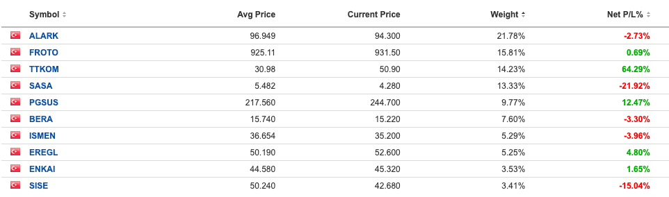Portföyde şu an 10 hisse bulunuyor. İlk üç hisse olan ALARK, FROTO ve TTKOM’un ağırlığı %51.