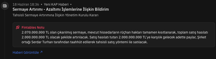 Ardından da tahsisli sermaye arttırımı haberi aldık.