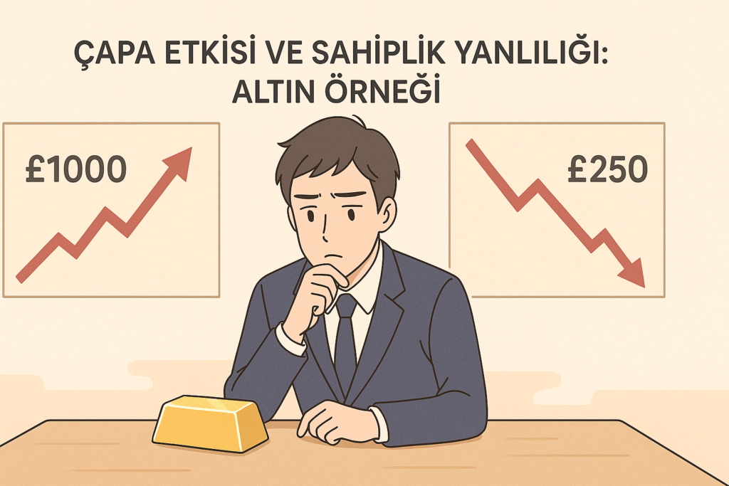Çünkü aklınız ilk başta ödediğiniz 50 TL’lik fiyata takılı kalmıştır. Bu durumun, yatırım psikolojisinde “anchoring (çapa etkisi)” olarak bilindiğini üstte öğrenmiştik. Ek olarak sahip olduğunuz şeye fazladan değer biçmeye de eğilimli hâle gelirsiniz. Buna ise “endowment bias (sahiplik yanlılığı)” denir. Erkeklerin eski tişörtlerini çok sevmeleri ve atmamaları bence en iyi örnek.