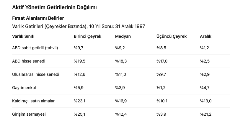 Dolayısıyla etkin olmayan piyasalarda bir yöneticinin üstün kişisel beceriye, yani aşağıda değineceğim “alfa”ya sahip olması şarttır. Bu, aslında etkin piyasalardan bile daha önemlidir. Çünkü etkin piyasalarda fiyatlar öyle sıkı hizalanmıştır ki, ortalamanın çok üzerinde bir performans göstermek zordur. Bu konuyla ilgili güçlü bir kanıt, Yale’den David Swensen’ın Pioneering Portfolio Management kitabında yer alan tabloda bulunabilir.